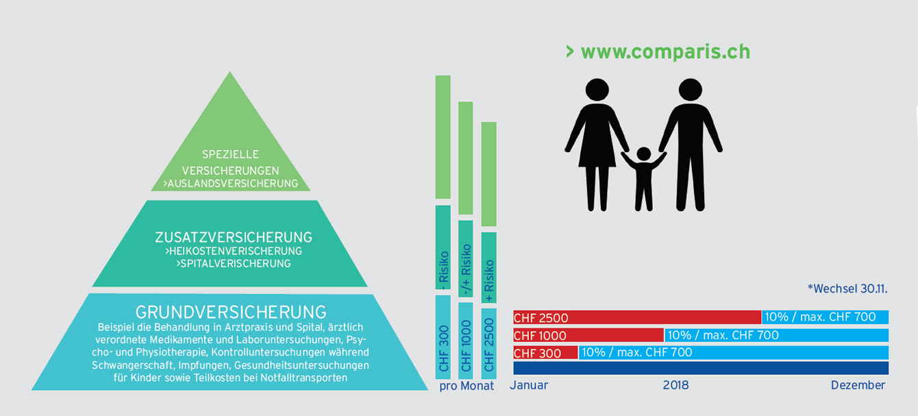 Alle Einwohnerinnen und Einwohner der Schweiz müssen zwingend selbständig eine Krankenpflegeversicherung (Grundversicherung) abschliessen. Wer in die Schweiz zieht, hat dafür drei Monate Zeit. Wird man in dieser Zeit krank, werden die Kosten auch rückwirkend getragen. Die Grundversicherung wird von zahlreichen privaten Krankenkassen angeboten. Die Auswahl der Krankenkasse ist frei. Die Krankenkassen müssen alle in der Schweiz wohnhaften Personen aufnehmen. Die Versicherten zahlen eine monatliche Prämie. Diese Prämien sind je nach Krankenkasse und Versicherungsmodell unterschiedlich hoch, deshalb lohnt es sich, die Angebote zu vergleichen. Die Krankenkasse kann man nur einmal im Jahr (November) wechseln. Die Grundversicherung übernimmt nicht nur die Kosten, wenn man krank wird, sie zahlt auch bei Schwangerschaft und Geburt. Die Leistungen sind gesetzlich geregelt. Achtung: Kosten für Zahnbehandlungen oder Brillen müssen in der Regel selber bezahlt werden.